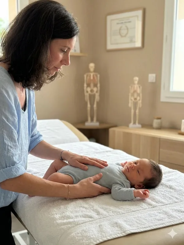 Les techniques utilisées chez le nourrisson sont extrêmement douces — rien à voir avec les manipulations pratiquées chez l'adulte. On parle de pressions très légères, de mobilisations millimétriques, d'un travail qui ressemble parfois plus à un simple toucher attentif qu'à un soin au sens habituel du terme. Bébé reste habillé tout au long de la séance.